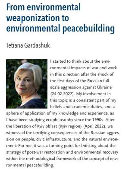 В травневому випуску EurSafe Newletter, що видається Європейським товариством з сільськогосподарської та продовольчої етики (European Society for Agricultural and Food Ethics) (https://www.eursafe.org/media-eursafe/newsletters) вийшов есей зав. відділом логіки та методології науки, доктора філос.наук Тетяни Гардашук «Від вепонізації довкілля до розбудови екологічного миру» («From environmental weaponization to environmental peacebuilding» (https://www.eursafe.org/.../Eursafe%20Newsletter%20May).