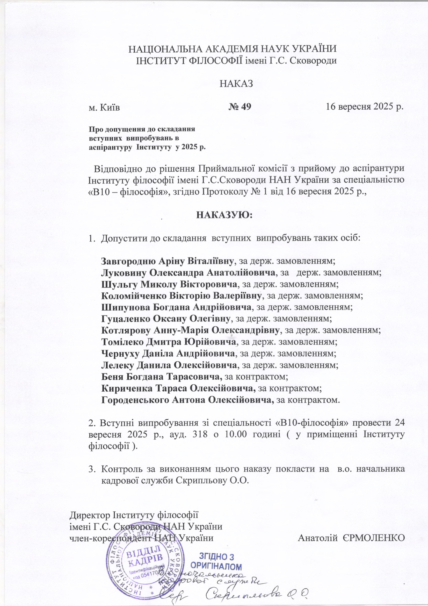 Відповідно до рішення Приймальної комісії з прийому до аспірантури Інституту філософії імені Г.С.Сковороди НАН України за спеціальністю «В10 - філософія», згідно Протоколу No1 від 16 вересня 2025 р.